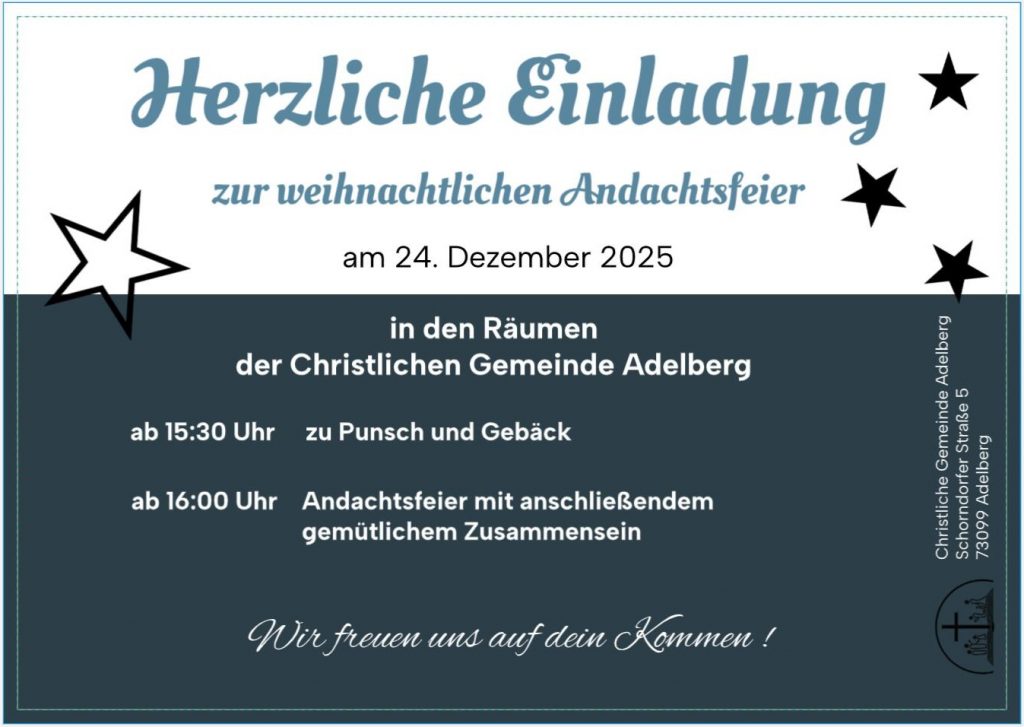Wir laden dich herzlich zu unserer Weihnachtlichen Andachtsfeier am 24.12.2025 in unseren Räumen ein. Ab 15:30 Uhr beginnen wir den Nachmittag mit Punsch und Gebäck. Nach der Weihnachtlichen Andachtsfeier, die um 16:00 Uhr beginnt, freuen wir uns noch über ein gemütliches Beisammensein.